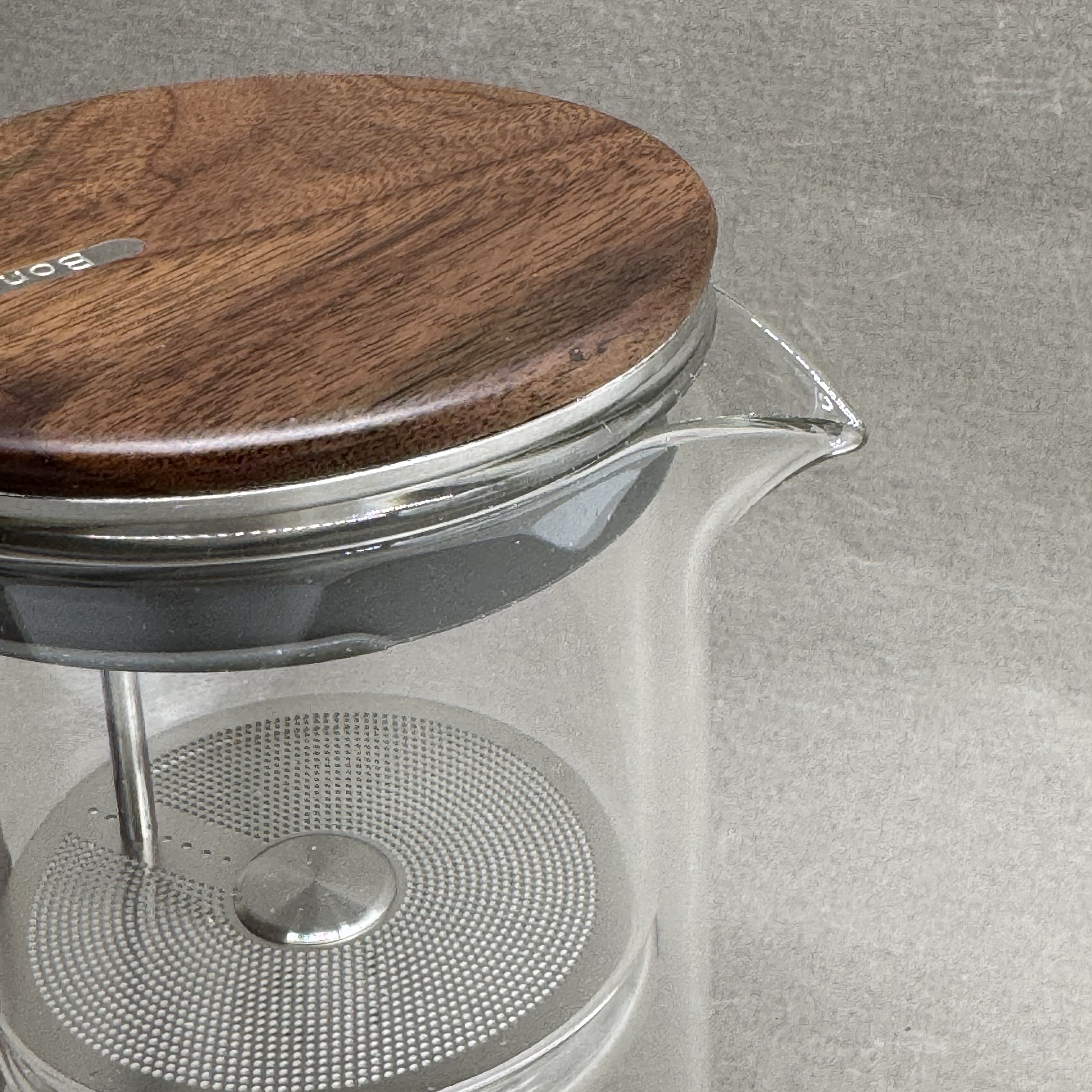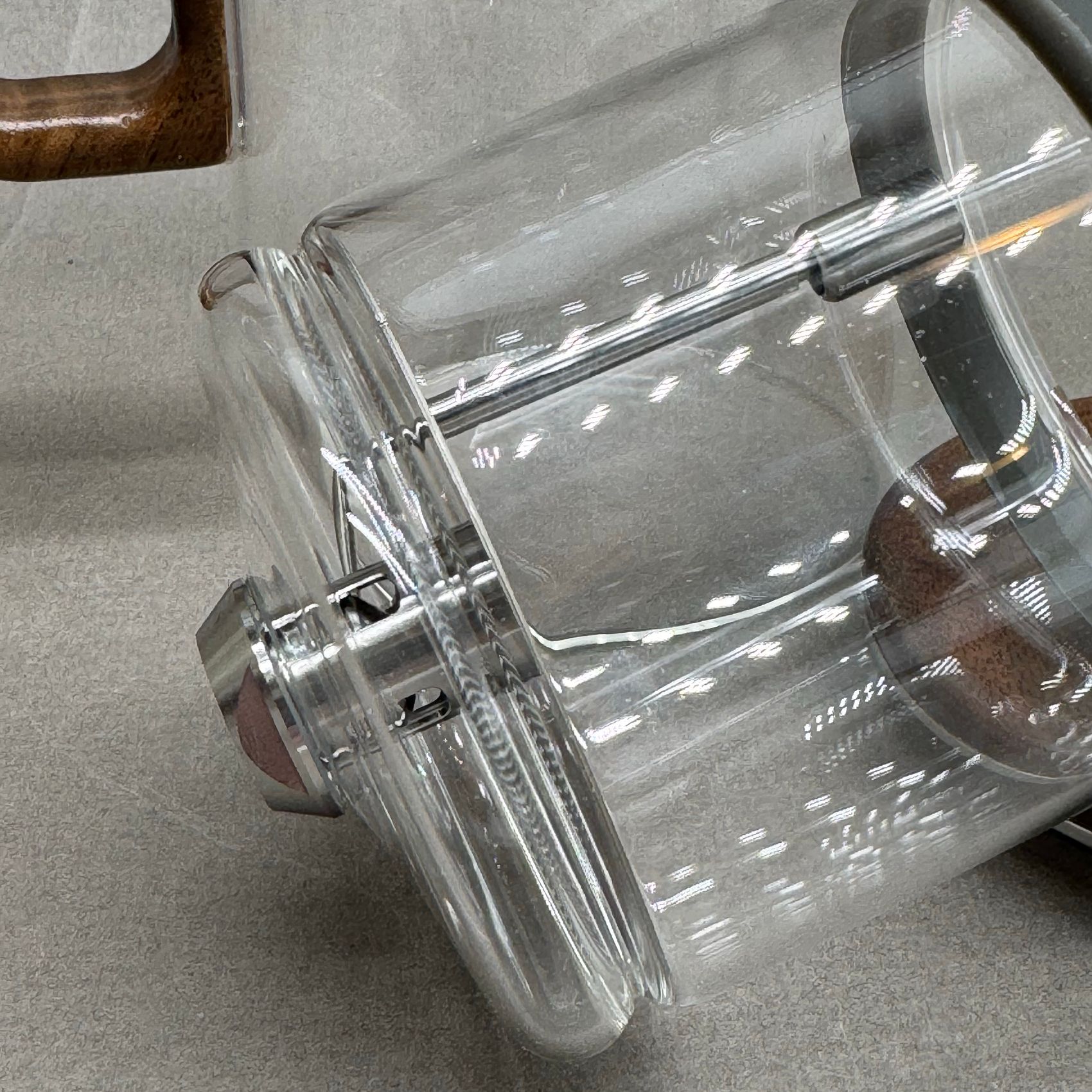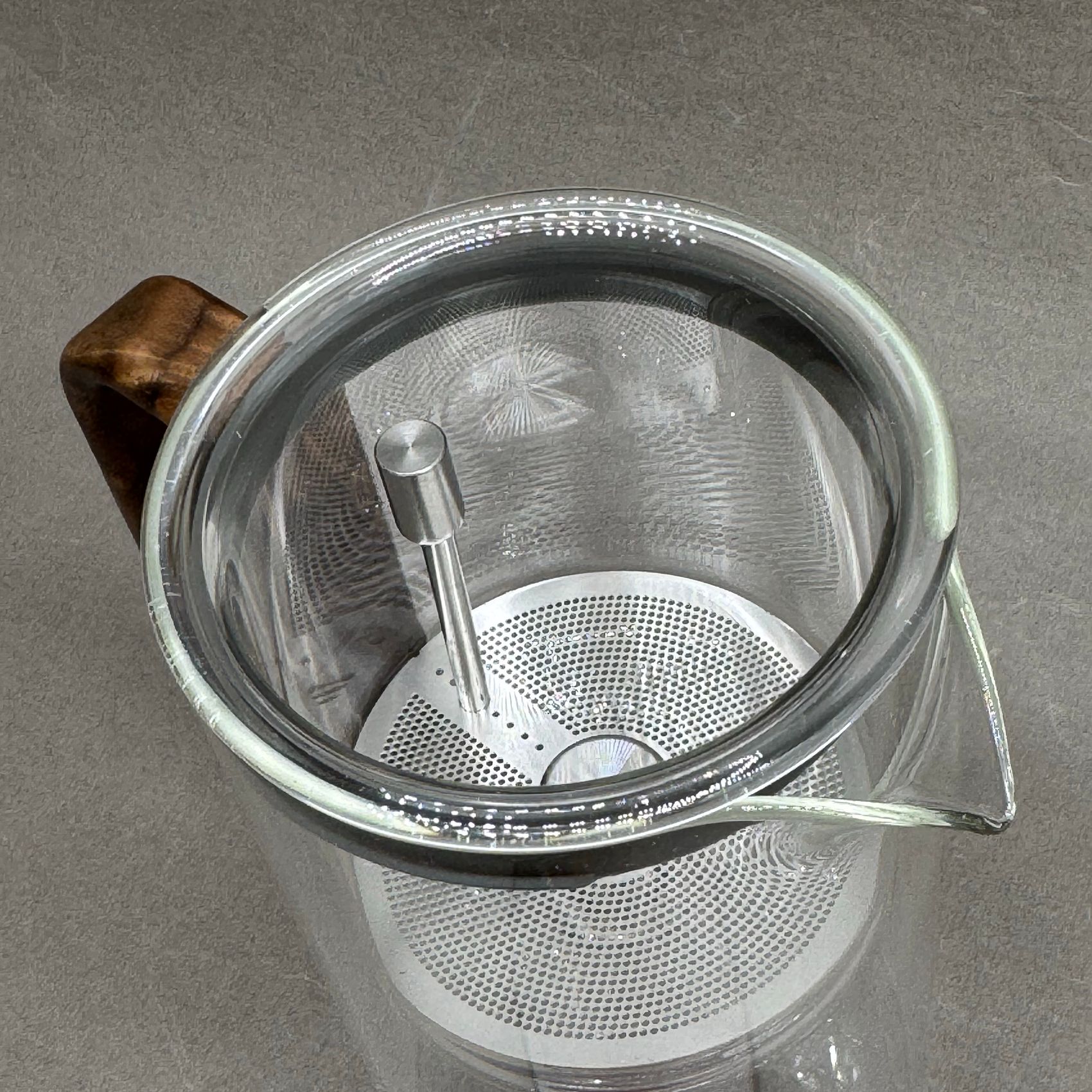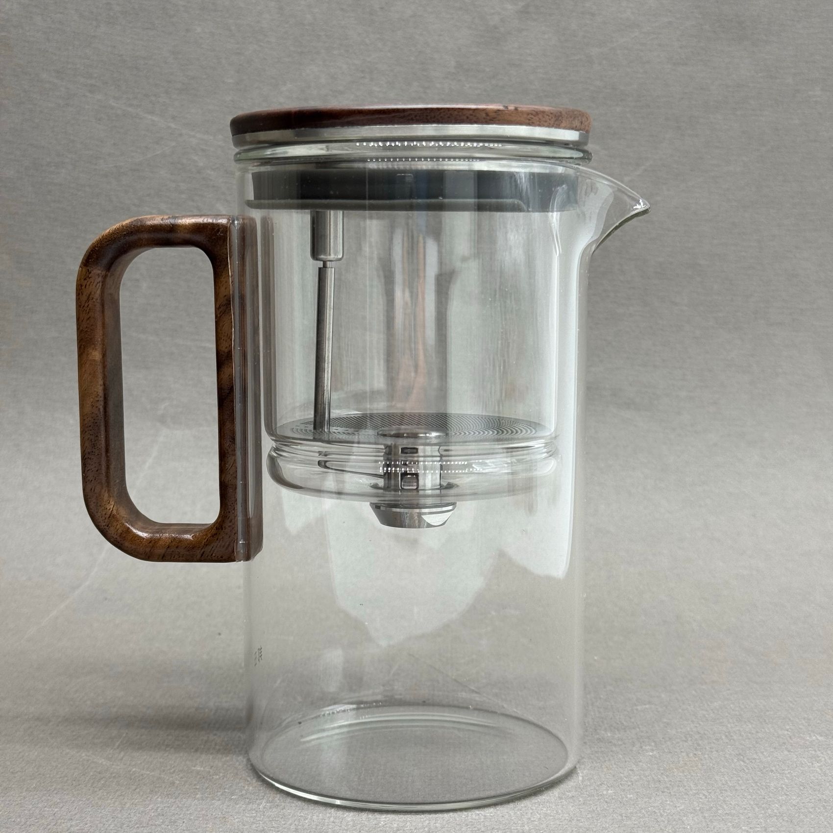Экспресс-чайник стеклянный в форме цилиндра. Емкость кувшина 500 мл., колба для заваривания стеклянная  емкостью 200 мл. Колба на кувшине не фиксируется, силиконовые уплотнители. Крышка у колбы съемная. Хорошо подходит для семейного чаепития.