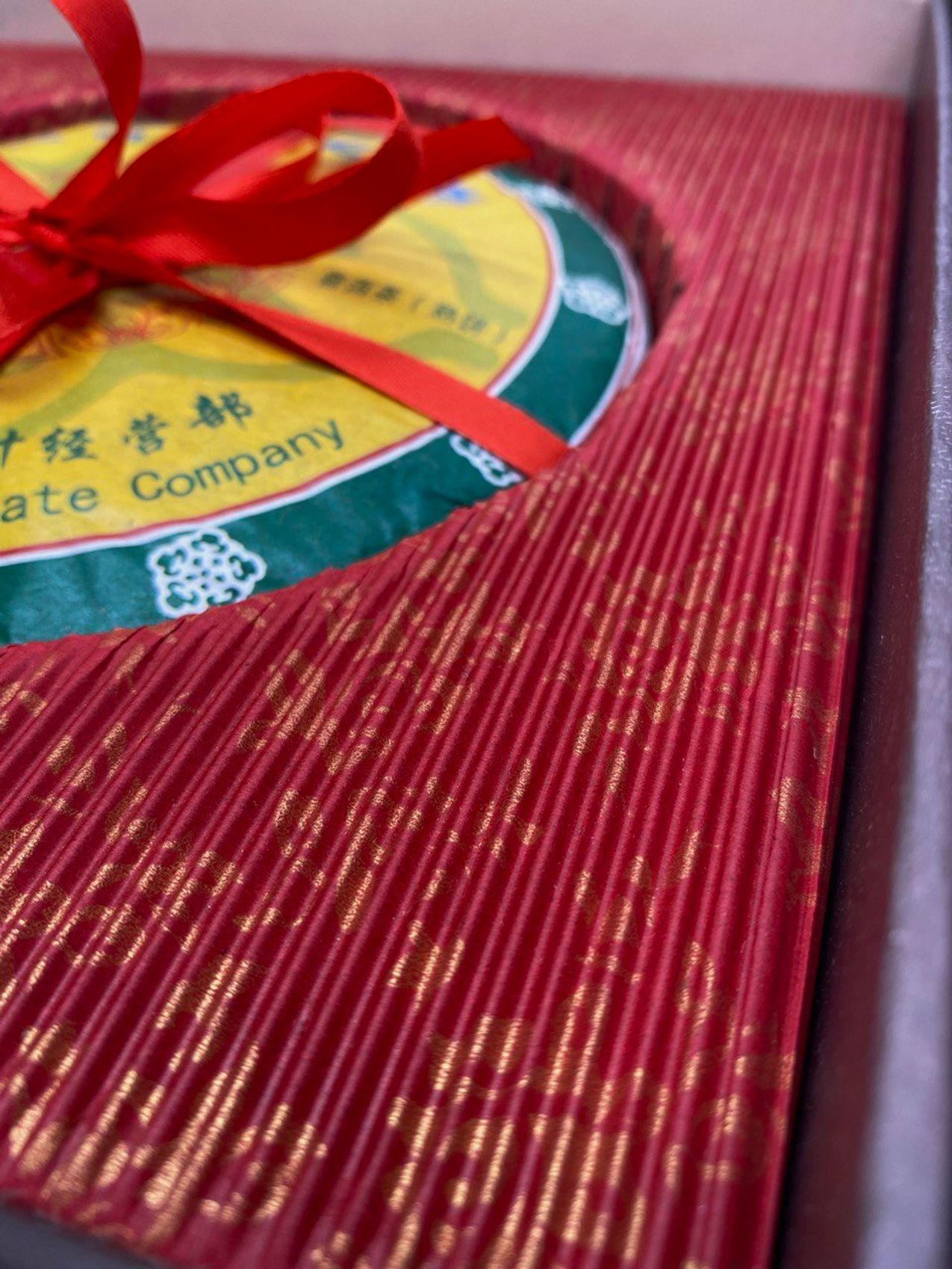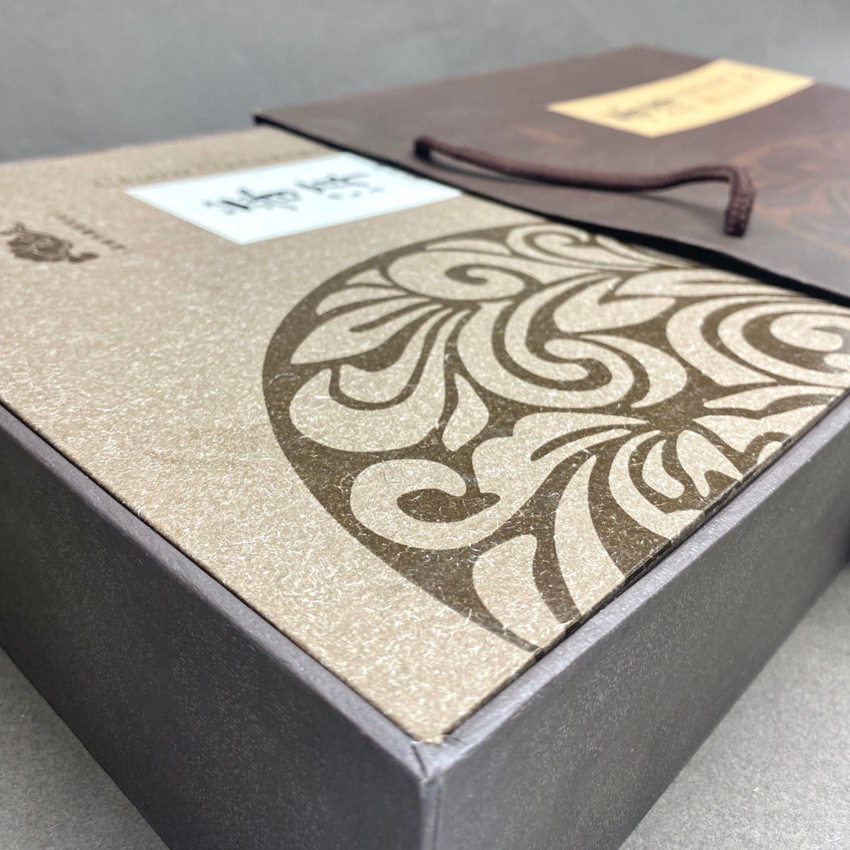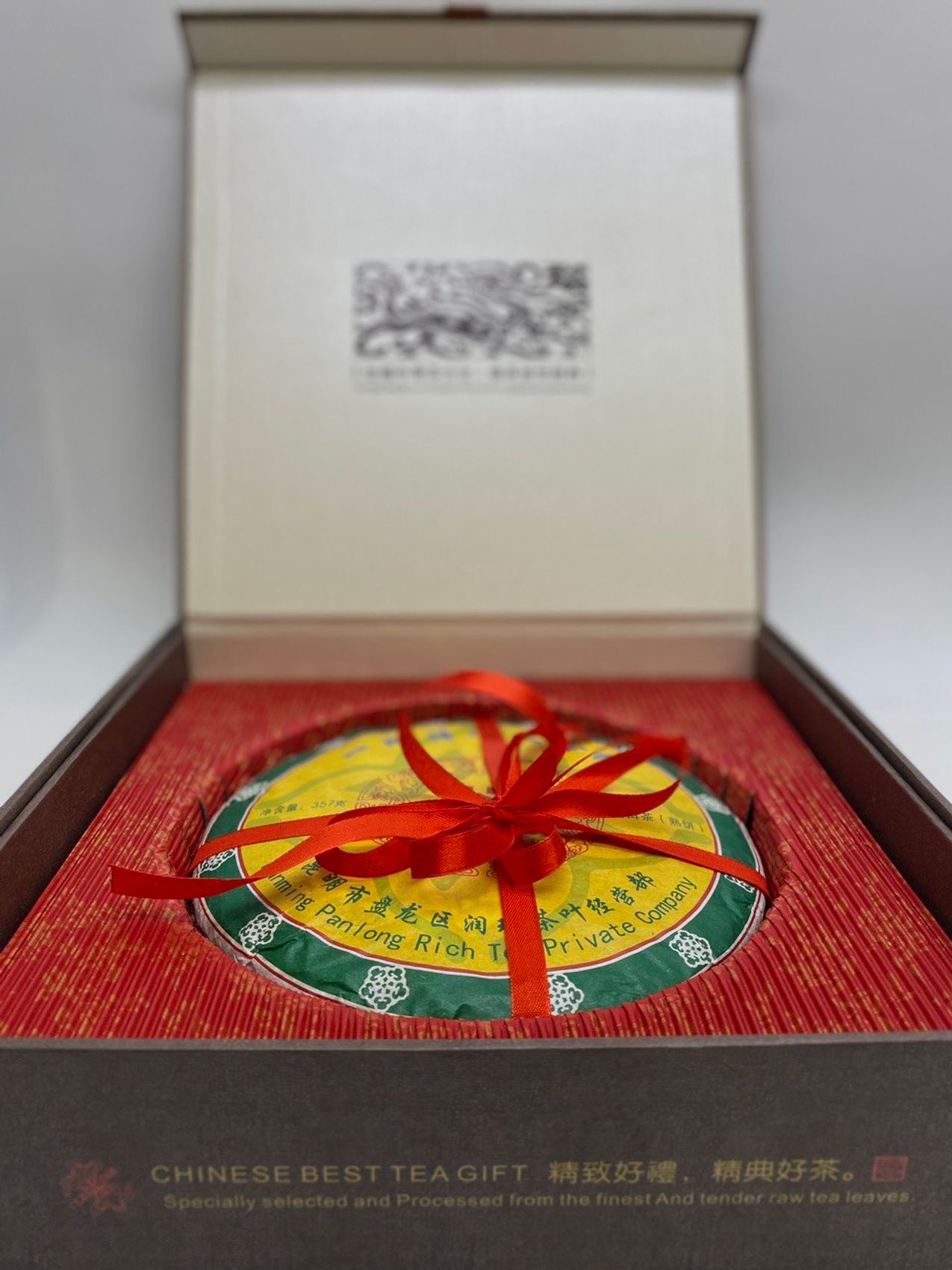 Подарочная коробка для пресованного в форме блина чая. Выполнена из плотного картона, с пакетом