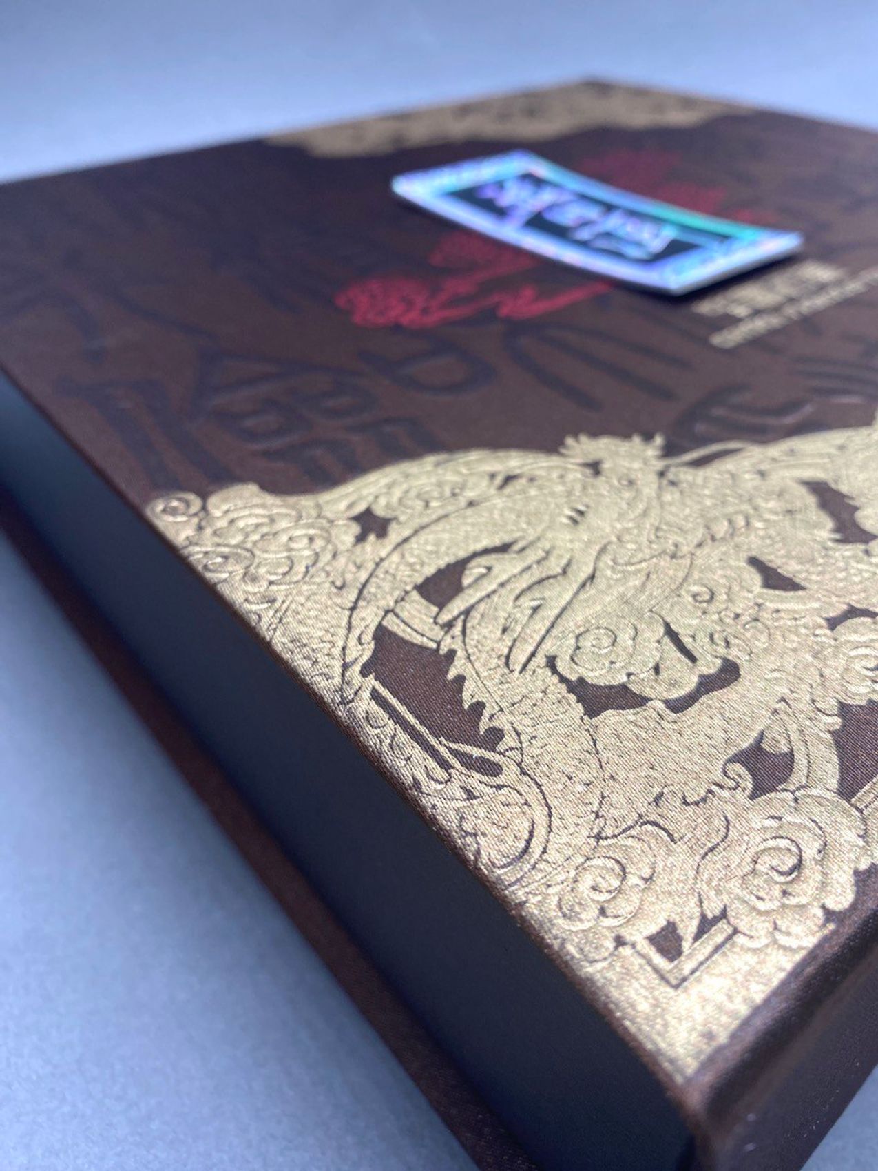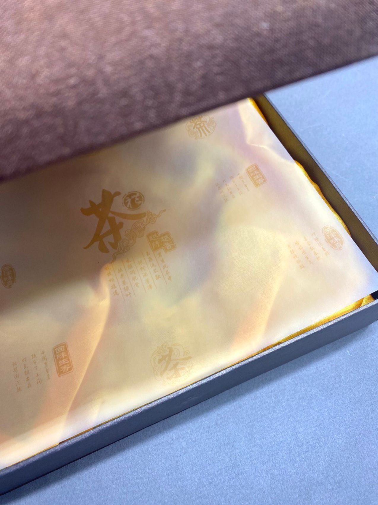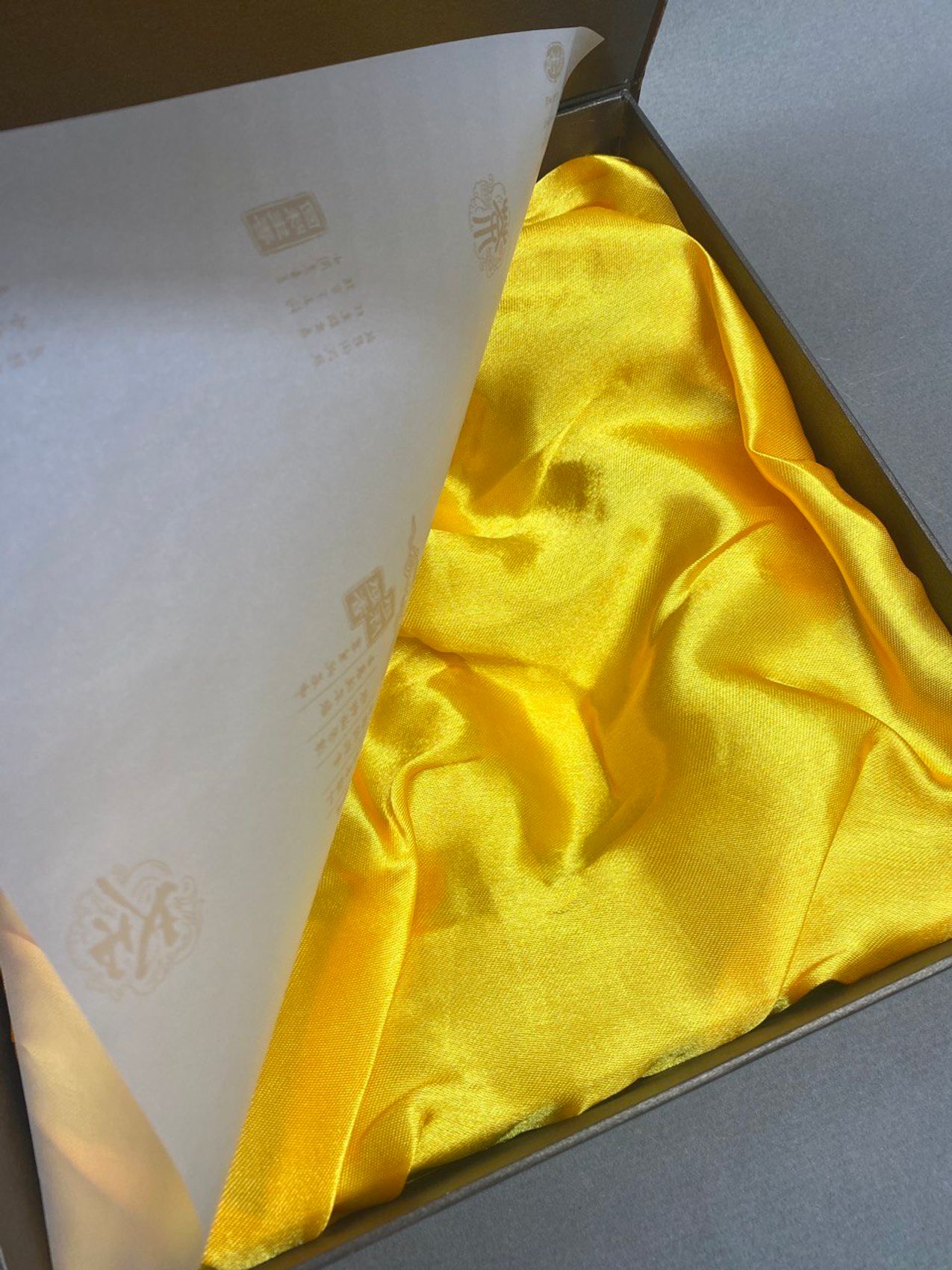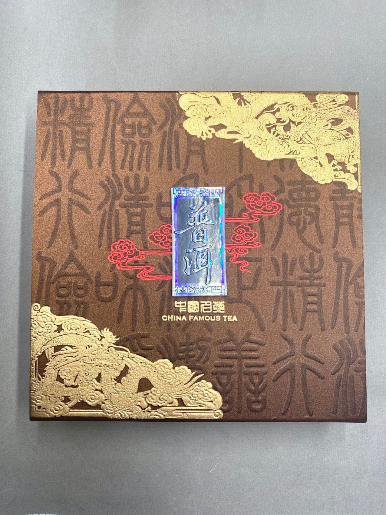 Подарочная коробка для прессованного в форме блина чая. Выболнена из плотного картона, обтянута тканью с тиснением